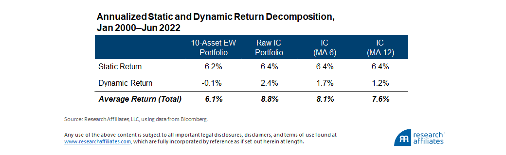 The identity states that the return of a portfolio with weights is driven by a static return component due to its average allocations and a dynamic return component driven by the co-movement of allocations with the next period’s asset returns. The equally weighted portfolio and the three IC portfolios all have a very similar static-component return, consistent with the fact they all have similar average weights. The outperformance of the IC portfolios is thus coming from beneficial market timing.