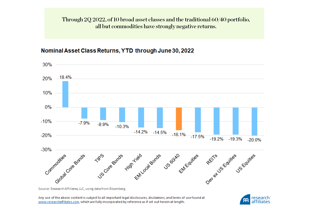 In the first two quarters of 2022, of 10 broad asset classes,1 all but commodities have negative returns. Likewise, investors who have come to bank on the hedging properties of the 60/40 portfolio in equity-market drawdowns have been grossly disappointed. Normal inflation hedges such as TIPS and REITs have also underperformed, even in nominal terms.