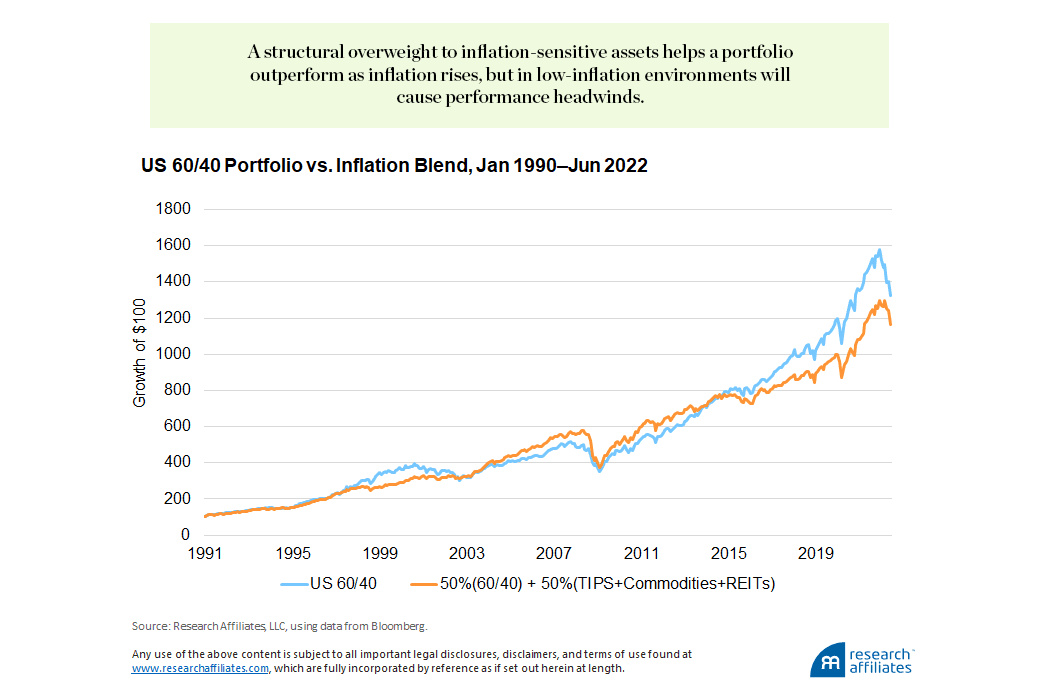 Believe it or not, option 1 may be a viable strategy, especially for those with a very long time horizon; if you are one of those investors, you can probably stop reading. Option 2 requires an investor to change structural portfolio allocations to tilt toward inflation-sensitive assets. Doing so means having a structural overweight to assets such as commodities, REITs, and TIPS. In an environment like the first half of 2022, that type of portfolio would outperform, but during the low-inflation 2010s it would have struggled to keep up.