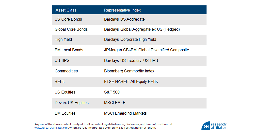 US equities, developed ex US equities, EM equities, US core bonds, global core bonds, high-yield bonds, TIPS (Treasury Inflation-Protected Securities), EM local bonds, REITs, and commodities.