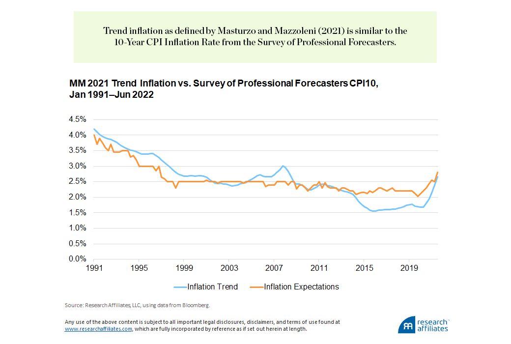 Masturzo and Mazzoleni use the term inflation cycle to describe a longer-term deviation relative to trend inflation. The way Masturzo and Mazzoleni define trend inflation, an exponentially weighted moving average (EWMA) of the year-over-year percentage change in All Items CPI, is quite similar to the inflation expectations published by the Survey of Professional Forecasters as the 10-Year CPI Inflation Rate (CPI10).