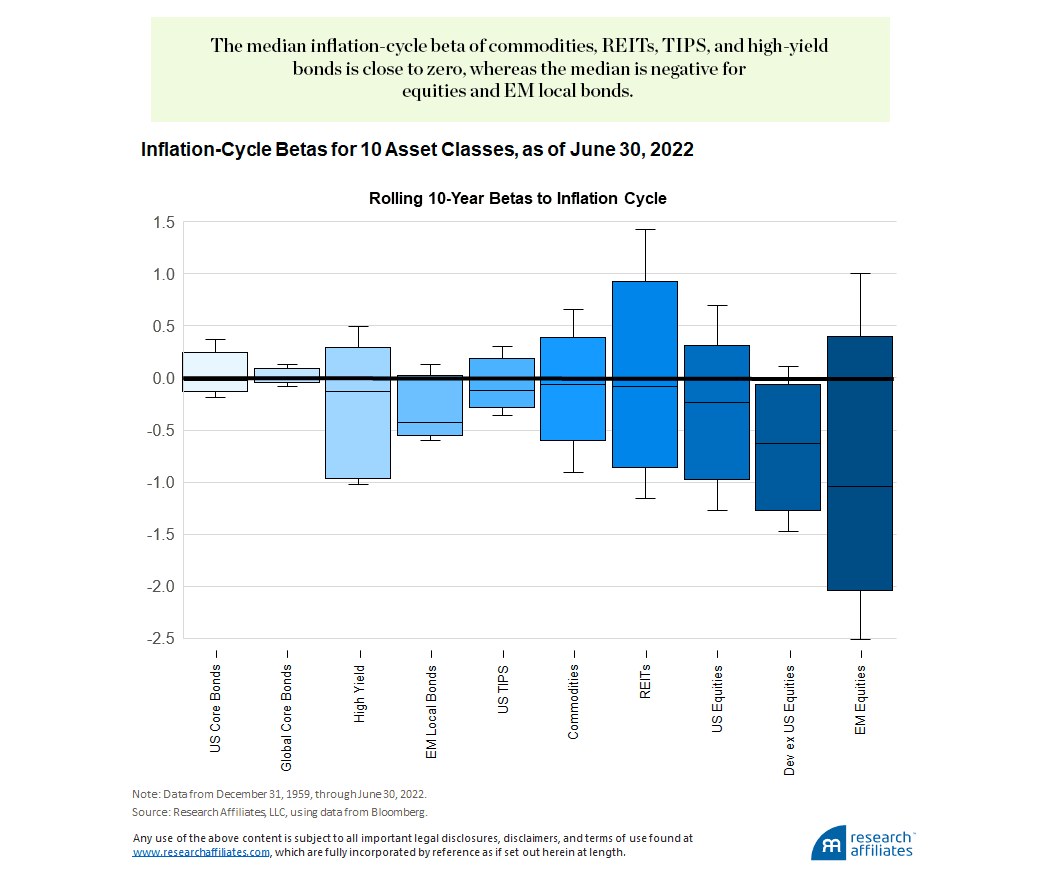 The median inflation-cycle beta is negative for most asset classes, but close to zero for inflation-sensitive assets such as commodities, REITs, and TIPS. Consistent with MM2021, the sensitivity to unexpected higher inflation, on average, is negative for equities. Possibly surprising is the fact that US core bonds often have positive sensitivity (higher returns) to unexpected higher inflation. This relationship appears to be consistent with unexpected higher inflation pushing markets into a risk-off posture.