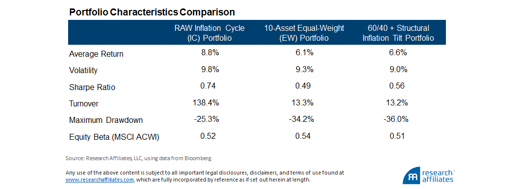 To create a portfolio we assign equal capital to each of the five assets with the highest signal values and keep the other five assets at zero exposure. The result is a long-only portfolio, which we call the Raw Inflation Cycle (IC) portfolio. We compare the Raw IC portfolio to the equally weighted 10-asset portfolio and to the 60/40 portfolio with a structural inflation tilt. The Raw IC portfolio is equivalent to creating a long−short portfolio with 100% gross/0% net exposure with a positive allocation to the highest ranked assets and negative allocation to the other assets, then adding the long–short portfolio to the equally weighted benchmark. The following table compares the characteristics of these three portfolios: