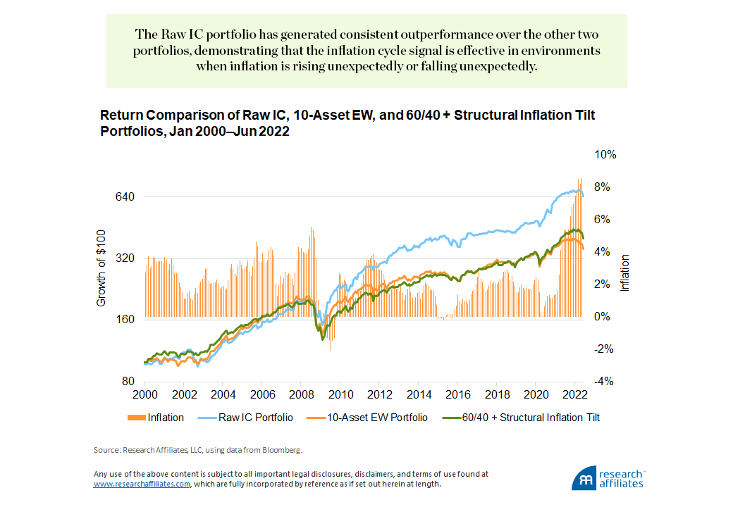 The inflation cycle signal can capture the differences between realized inflation and expected inflation and is thus effective in environments when inflation is rising unexpectedly or falling unexpectedly.