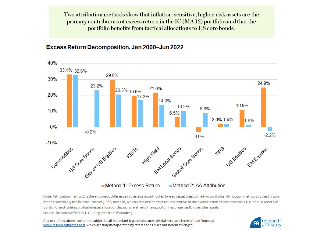 Using two different return attribution methods, we find the approach benefits from higher tactical allocations to inflation-sensitive asset classes and to US core bonds when profitable to do so.