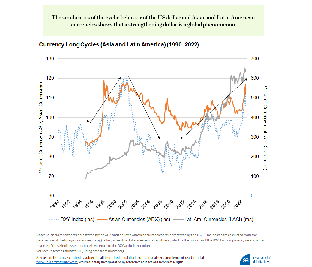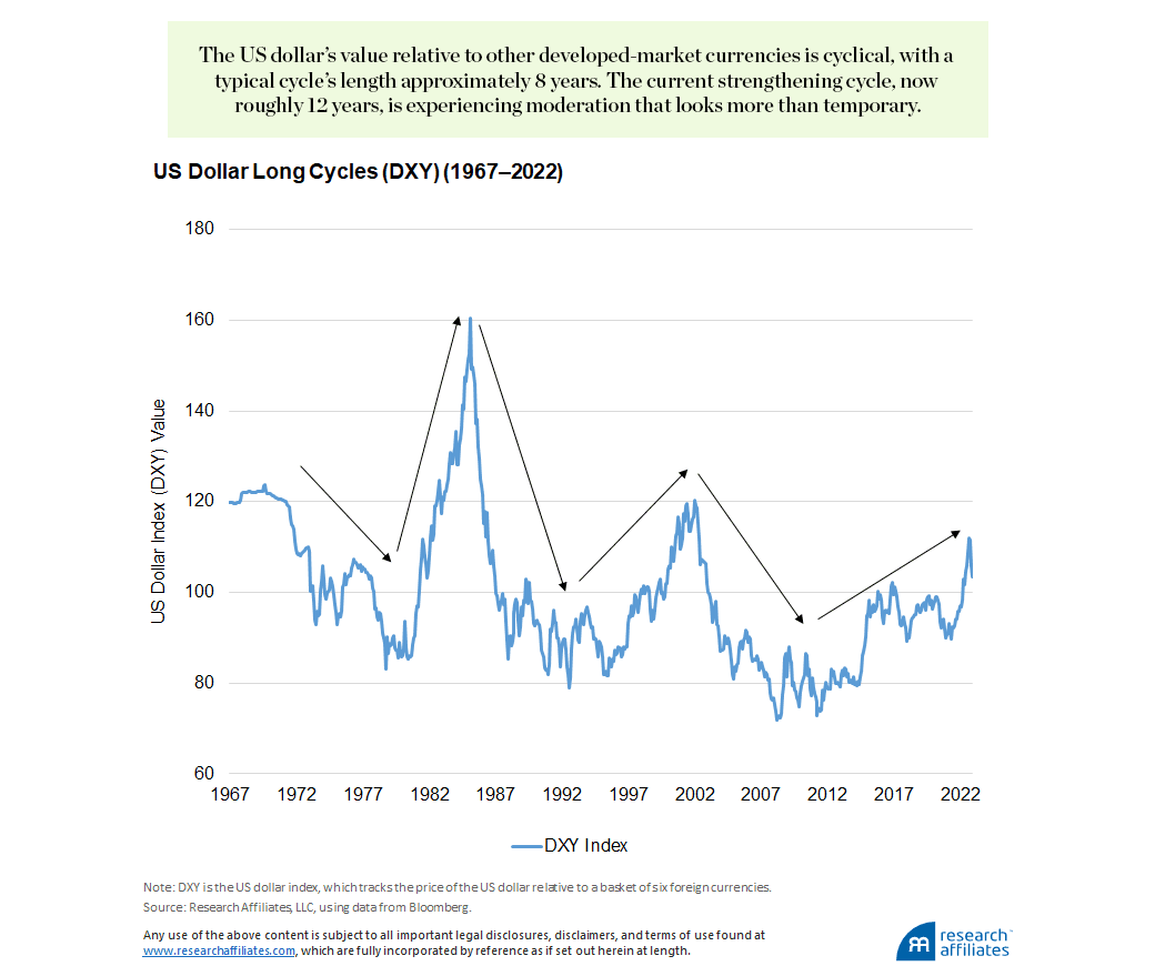 Over the DXY’s history, which begins in 1967, we notice two things. First, the US dollar relative to the other developed-market currencies is cyclical, rising and falling over time. This relationship looks very different from the price behavior of capital assets, such as the S&P 500 Index, which tends to increase over time, continually hitting higher lows and higher highs. This difference highlights the push–pull dynamics of currency indices, which represent a trade-off of like things, one currency for another, as opposed to, for example, one currency for shares of a company.