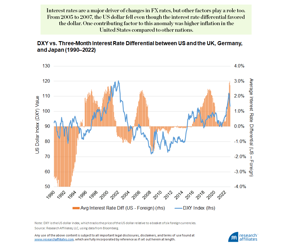 Time-varying lead–lag relationships can make it difficult to use interest rates as a timing signal for changes in FX rates. Nevertheless, even a simple chart of US three-month interest rates relative to an equally weighted basket of three-month rates in the United Kingdom, Germany, and Japan highlights that the dollar rises when the rate differential is positive (US rates are higher) and falls when the differential is negative (US rates are meaningfully lower). The years 2005–2007 are an obvious outlier: US interest rates were rising, but the dollar was falling. One explanation for the typical relationship’s not holding is that US inflation was rising during this time, especially compared to Japan’s inflation rate. This example highlights that currency movements are the product of a number of interrelated and time-varying drivers.