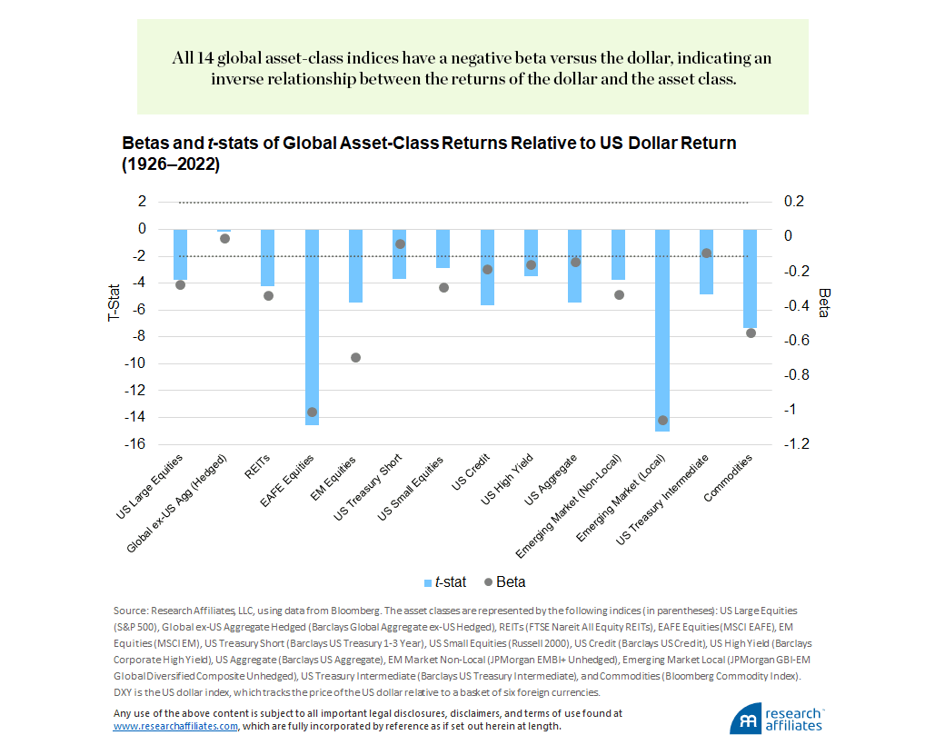 Each of the 14 indices has a negative beta, an inverse relationship between the dollar’s return and the asset’s return. Across the board, with the exception of hedged global-developed-market bonds, proxied by Barclays Global Aggregate Ex US (hedged) Index, the betas’ t-stats are highly significant, having a value less than −2.