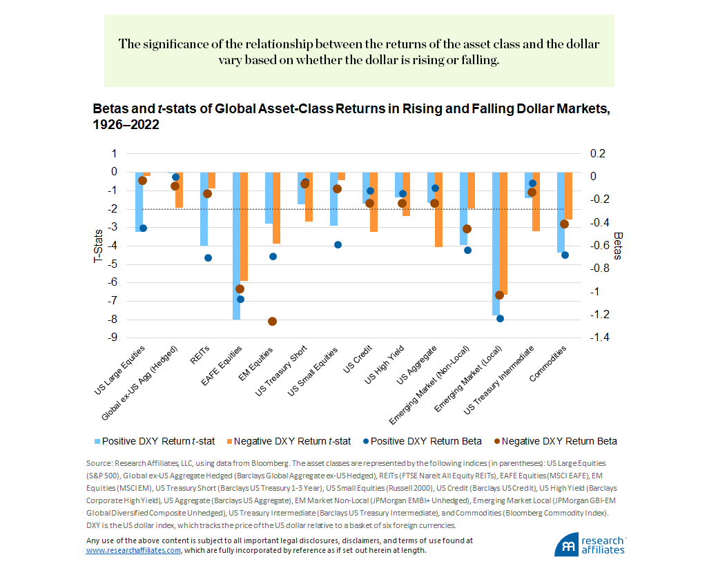 Although the general trend is the same across all the asset classes, we note that the significance of the relationship can vary between rising- and falling-dollar scenarios. Most notably, US domestic risk assets—as represented by the S&P 500, FTSE Nareit All Equity REITS, and Russell 2000—have statistically significant betas when the dollar is rising, but insignificant betas (i.e., insignificant effects on asset prices) when the dollar is falling. This highlights that dollar strengthening can also be associated with a flight-to-safety, global-risk-off environment.