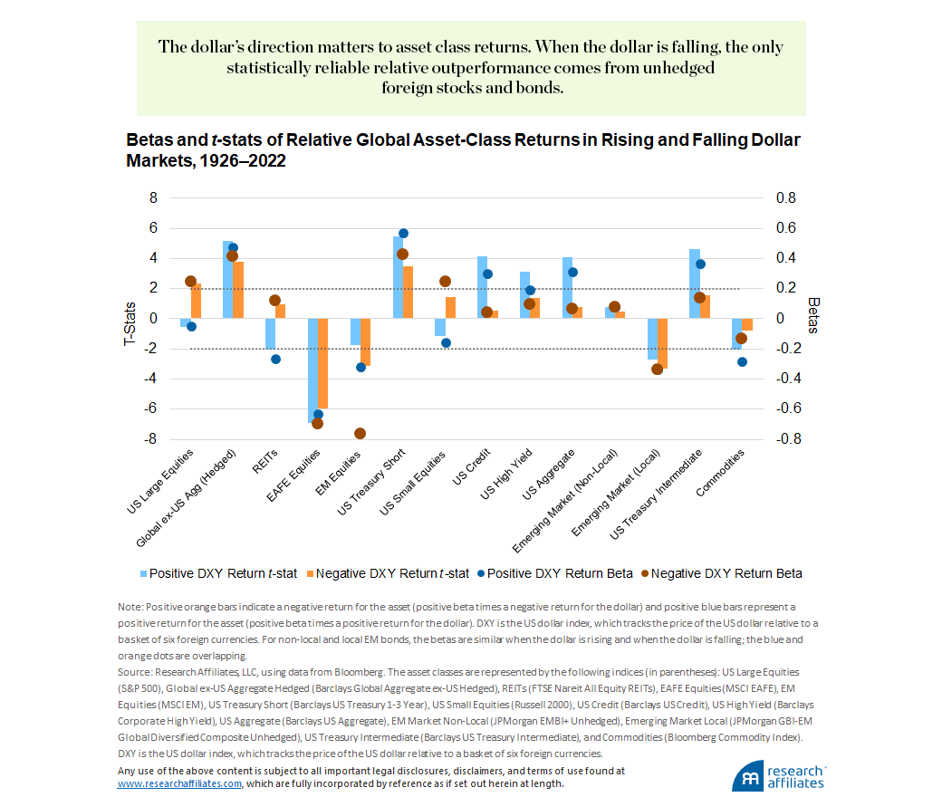When the dollar is falling, the only statistically reliable relative outperformance comes from unhedged foreign stocks and bonds.
