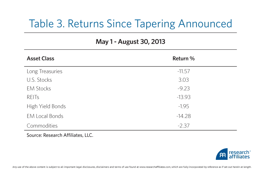 When U.S. rates ultimately rise (normalize), it is reasonable to expect some unwinding of the carry trades. If the 10-year Treasury rate were to hit 5%, then emerging market bonds would lose much of their appeal at their current blended yield of 6%. This very same dynamic will be in full force for all other asset classes; it has already impacted returns significantly since the tapering announcement in June (Table 3). U.S. equities, judging from their initial sharp negative response to the tapering announcement, have become bond like! Bad employment numbers and weak housing starts are now good news for equities as they keep rates low. High yielding stocks, which have enjoyed significant outperformance in the recent years thanks to their income advantage in a low rate world, appear to be most at risk.