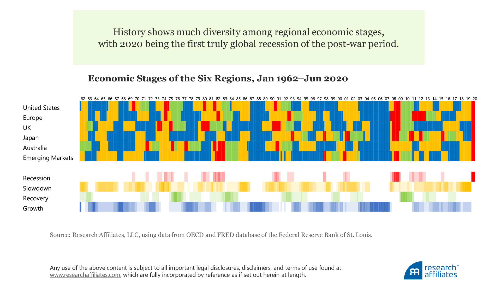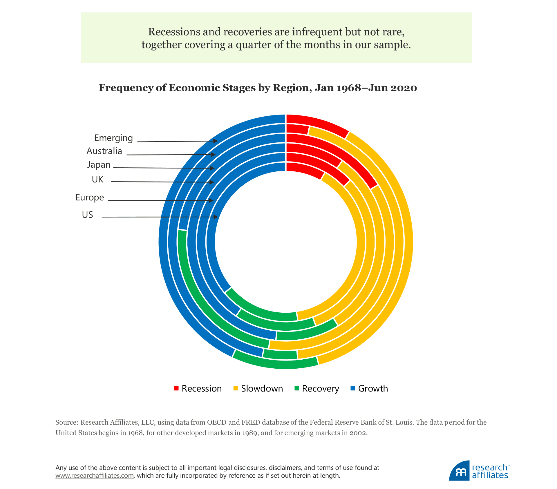 Japan did not experience a recession during its post-World War II economic recovery, but after an asset bubble of extraordinary proportions burst in 1992, the nation suffered a chain of recessions and recoveries. In stark contrast, Australia has the lowest proportion of recessions and recoveries, composing only 8% of the nation’s data set. Before 2020, Australia’s last recession was in the early 1990s. The nation avoided both the late 1990’s tech tumble and the 2008 credit crisis that plagued all other regions in our sample.