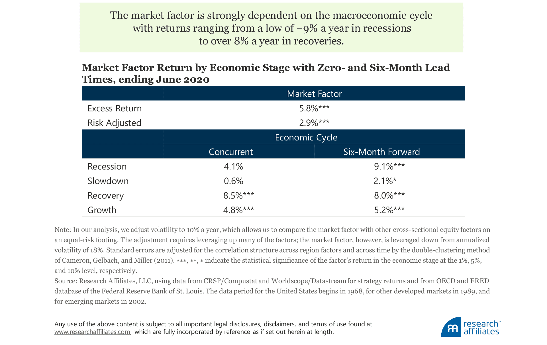 Across the four economic stages, two major themes are at play: economic leverage and momentum.Historically, the market factor has significantly underperformed in a seemingly repetitive fashion. In other words, the market factor earns different returns over the stages of the business cycle. Research Affiliates’ analysis shows this to be true. Our analytical framework defines four economic stages using information on real gross domestic product (GDP) and the OECD system of Composite Leading Indicators (CLIs):1