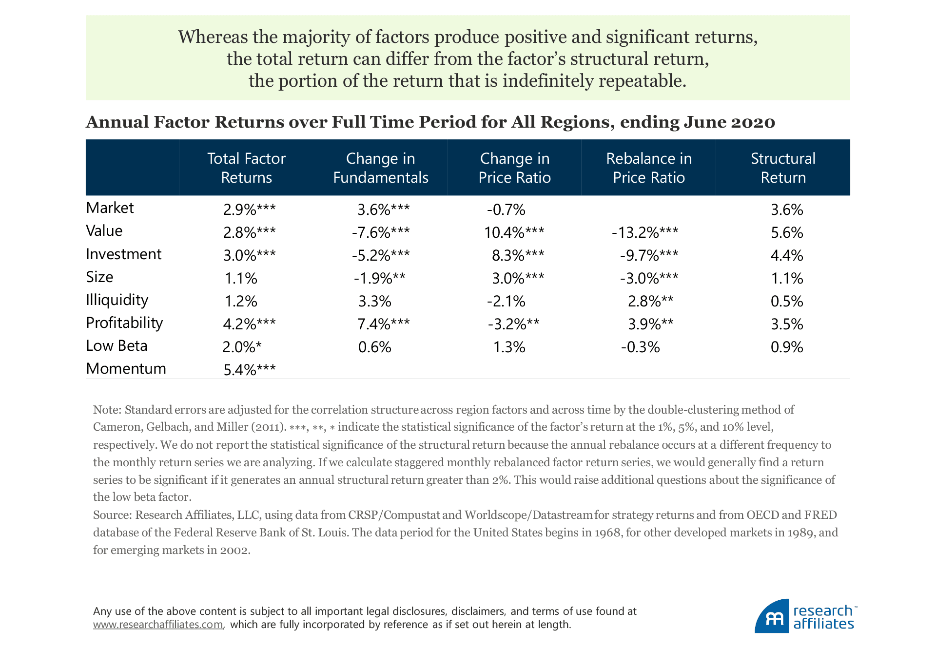 Fewer factors produce meaningful returns when we consider a factor’s structural return, the portion of the return that is indefinitely repeatable. Over the study period, the value factor has the highest structural return.