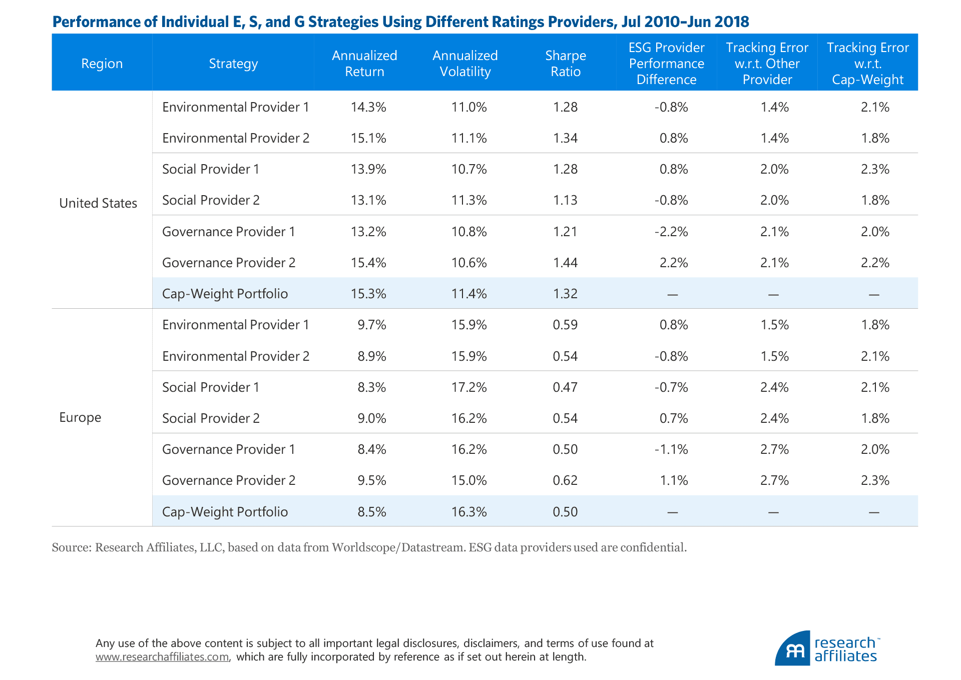 To vividly illustrate this point, we analyze two popular comprehensive ESG data vendors, which we call Provider 1 and Provider 2.5 We construct two separate portfolios, one in the United States and one in Europe, using ESG ratings data from both providers. We then examine the differences in performance and portfolio characteristics of the US/Provider 1 and US/Provider 2 portfolios as well as the Europe/Provider 1 and Europe/Provider 2 portfolios.