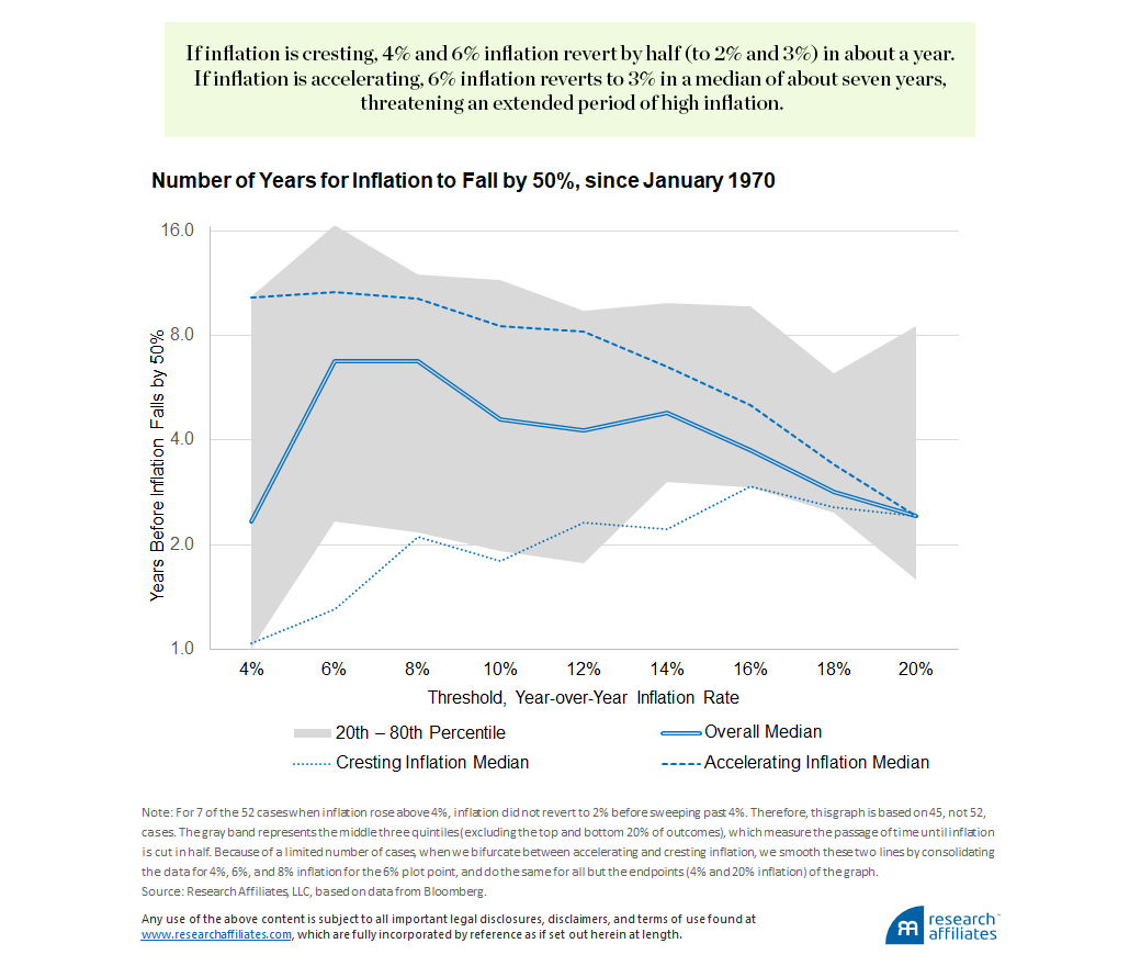 If inflation is cresting, inflation levels of 4 or 6% revert by half in about a year. If inflation is accelerating, 6% inflation reverts to 3% in a median of about seven years, threatening an extended period of high inflation.